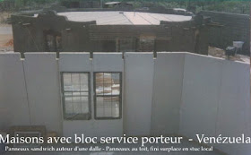 Photo above shows three 'wet modules' being built at Louisiana plant. These bathrooms are fully tested before being loaded in a container. Their corner posts projecting downward allow plumbers and electricians to go under if needed. These 'high heels' are simply cut-off with a chainsaw before loading. Containing the service entrance panel and the back 'wet' wall to the kitchen, those compact modules are the coe of all Archimede houses, removing at leat 50% of all technical tasks at the building site, speeding up assembly immensely. Below, a 120 m2 (1300 ft2) 2-story house that can be built for well below $50,000. A few of these were erected in Venezuela in 1994.