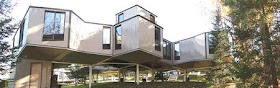 These condos built in 1983 are owned by The Club Archimede Vacation Club They are very popular, allowing 'ski-in/ski-out' access by simply skiing to your front door on the ground floor, with paths taking the shorter route UNDER other condos. The unique injected panels are sealed to each other along the edges of what are rhombododecahedral shells with incredible rigidity. The cavity under the floor is pressurized with warm air so that all floors are warm, the bathroom being the warmest of all because of the proximity of the electric furnace. An interesting design detail is that holes are drilled trough that floor into which short lengths of pipes are inserted. Over these pipes ski boots are inserted to have them warm and dried.