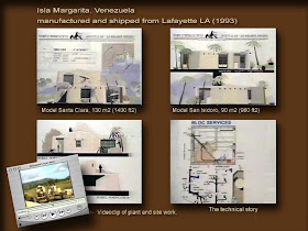 At the right, the 'San Isidro' version of the house above as being completed in Isla Margarita VE. Note that three or more houses could be shipped into 2 40-ft containers and that erection time of these prior to stucco finish is only a matter of a few days, thanks in part to the fact that the more technically complex wet module carries most of the wiring and piping. This is why we at the Institute call this concept by Poirier the 'heart-lung' module of any house we fabricated.